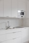 Vardagsrummet är målade i en mjuk nyans av vitt och golvet går i samma färgskala vilket ger en naturlig och lugn ton. Stora fönster släpper in rikligt med dagsljus och från rummet finns en dörr ut till balkongen. Rummet har en naturlig avgränsning mot köket genom den uppsatta halvväggen. Detta skapar en känsla av öppenhet utan att helt förlora intimiteten. I vardagsrummet finns det plats för soffa och ett matbord. Det är en funktionell och trivsam plats som bjuder in till både avkoppling och social samvaro.
