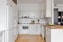 Trivsamt kök där köksinredningen går i vitt. Här finner man god arbetsyta och god skåpsförvaring. Kök och vardagsrum möts i en öppen social planlösning som ger plats både för matbord och ett stort soffrumsmöblemang. Köket har vitt kakel satt som stänkskydd, bänkskiva i massiv ek samt en bardisk mot vardagsrummet som öppnar upp för sociala stunder. Den maskinella köksutrustningen består av ugn med spisplattor, spisfläkt samt kombinerad kyl och frys. Under vasken i köket finns det även möjlighet att installera en diskmaskin.