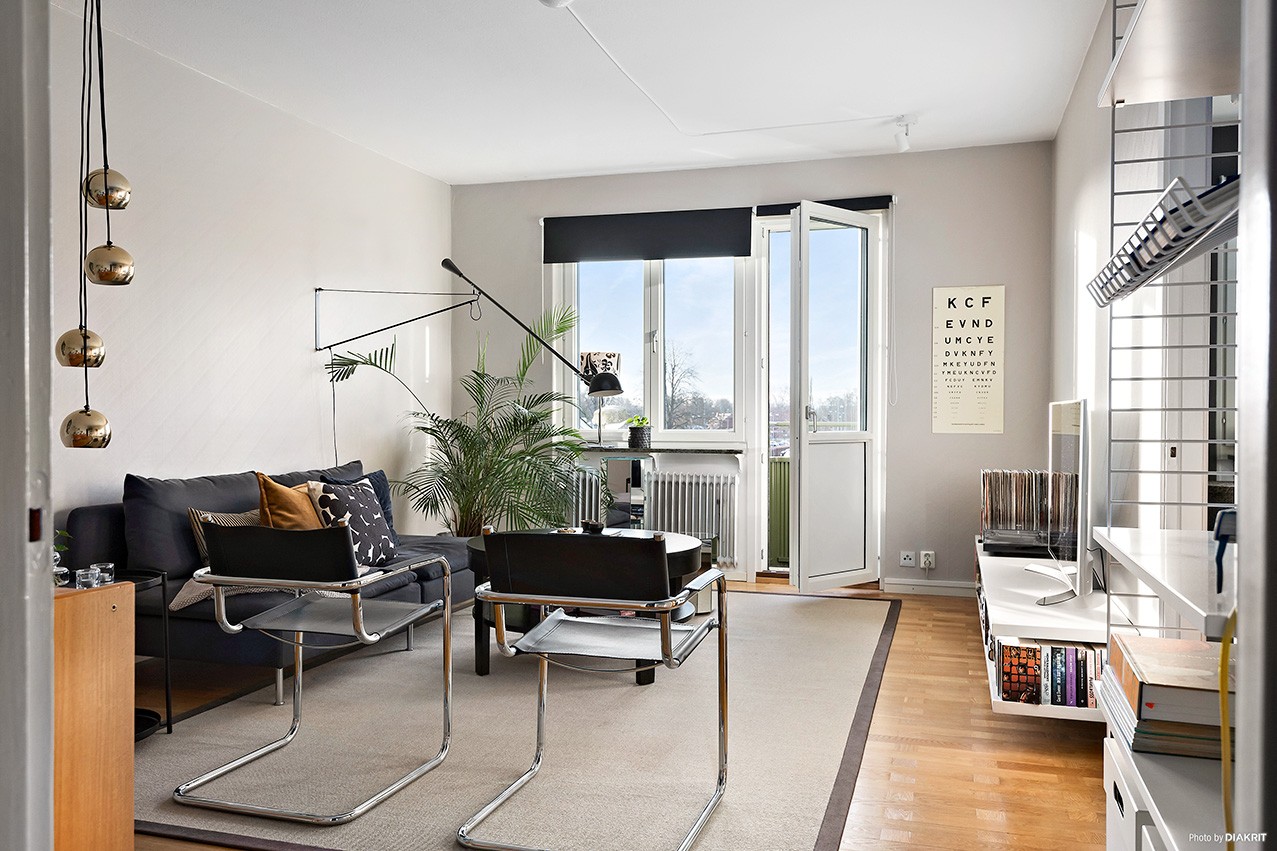 Vardagsrummet bjuder på ett härligt ljusinsläpp och utgång till balkongen. Från både balkongen och fönsterpartiet öppnar vyerna upp sig över området och upp mot odlingsbacken och kolonilotterna. Rummet erbjuder gott om plats för en stor soffgrupp, TV-möbel och annan inredning efter eget tycke. Balkongen rymmer ett mindre bord med tillhörande sittmöbel.