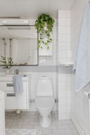 Badrummet är helkaklat i en sammanhållen färgskala som är genomgående ljus. Här finns ett badkar samt tvättmöjligheter med tvättmaskin. Vidare finns en tvättställ med kommod, badrumsspegel samt WC.