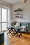 Ni fortsätter in i allrummet som med en härlig takhöjd i kombination med ett flödande ljusinsläpp bidrar till en luftig bostad. Här ryms enkelt en soffhörna, matbord eller ett hemmakontor med skrivbord. Sovalkoven ger även plats åt en större säng. Från fönsterpartiet och den franska balkongen har ni vyer ut över föreningens välskötta innergård.