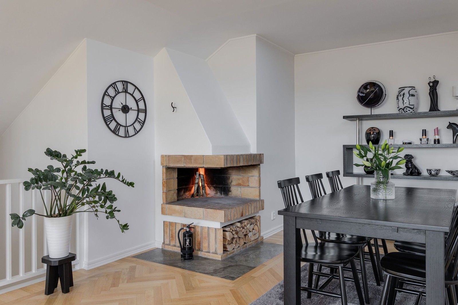 En trappa upp finner ni bostadens underbara och tilltagna sällskapsrum som ger goda möbleringsalternativ antingen som sociala ytor eller som sovrum. Den öppna spisen skänker charm- och mysfaktor och det stora fönsterpartiet samt takfönstret ger fint ljusinsläpp. Härifrån nås ett rymligt förråd som skänker goda förvaringsmöjligheter.