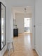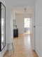 Välkomnande, tilltagen och ljus hall med öppna inredningsbara ytor. På golvet ligger ljust och väggarna är vitmålade.