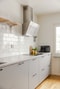 Köket erbjuder bekväma arbetsytor som gör matlagningen både smidig och trivsam. Den grå köksinredningen samspelar elegant med det vita kaklet och skapar en modern och enhetlig helhet. Intill fönsterpartiet finns plats för ett mindre matbord. Den maskinella utrustningen består av integrerad diskmaskin, spishäll, spisfläkt, inbyggd ugn och mikrovågsugn samt kombinerad kyl och frys. Allt samlat i en funktionell och välplanerad köksmiljö.