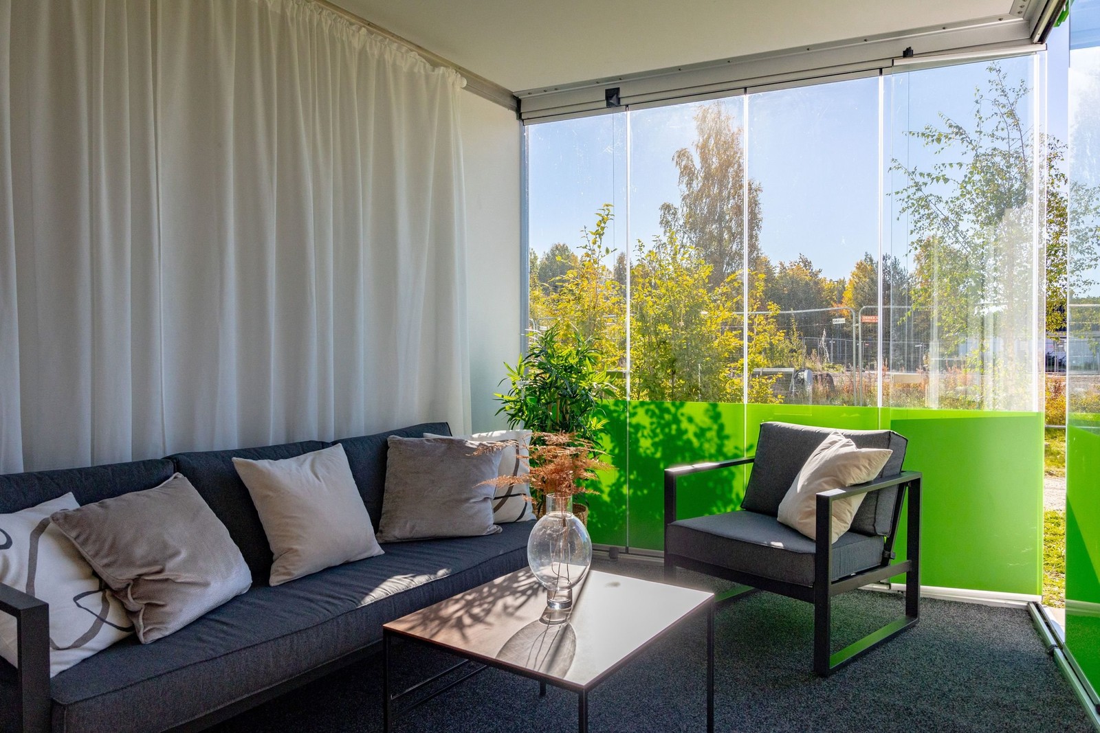 Fint vardagsrum med stora ytor vilket ger flera möbleringsalternativ. Vardagsrummet rymmer ett större soffgruppsmöblemang. Tack vare den attraktiva planlösningen finns det naturliga flöden in till köket och bostadens två sovrum. Från rummet når man bostadens inglasade och rymliga balkong. Här finns det gott om plats för umgänge och här ryms en sittgrupp. Belägenheten i markplan gör att man på ett enkelt sätt kan nå utemiljön från balkongen.