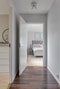Hall: Man välkomnas in i en hall där avhängningsytan direkt till höger tar hand om skor och ytterkläder. Direkt från hallen öppnar bostaden upp sig vilket ger en välkomnade känsla. Golvet och färgsättningen på väggarna följer med in i bostadens sociala delar.