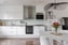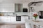Köket har en köksinredning i vit färgsättning vilket kombineras med en mörk bänkskiva. Köket erbjuder både smart förvaring och bekväma arbetsytor. Den öppna planlösningen in mot vardagsrummet ger gott om plats för en matplats. Arbetsytorna belysas av spotlights för ett behagligt arbetsljus. Den maskinella köksutrustningen består av ugn, spishäll, spisfläkt, integrerad diskmaskin, mikrovågs ugn samt kyl och frys i fullhöjd.
