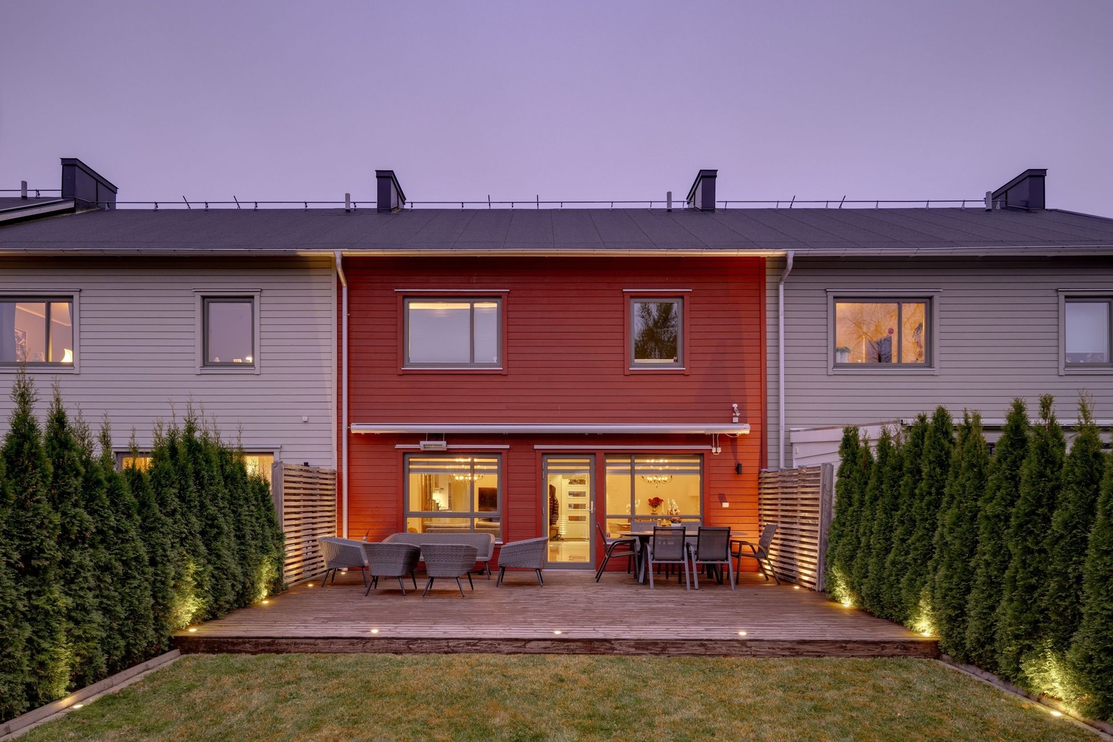 Det stora vardagsrummet erbjuder gott om plats för både en soffhörna och en separat matgrupp. Väggarna är målade i en ljus nyans som tillsammans med det enhetliga golvet, som löper vidare från hallen och köket, skapar ett snyggt helhetsintryck. De stora fönsterpartierna ut mot den utemiljön släpper in ett generöst ljus och ger en härlig känsla av rymd och öppenhet. Från vardagsrummet når ni det soliga trädäcket som har gott om plats för ett stort utemöblemang. Här kan ni enkelt skapa en trivsam och inbjudande uteplats där familj och vänner samlas för sociala stunder och mysiga grillkvällar.