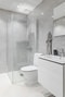 Det här helkaklade badrummet är inrett med ljusa plattor på både golv och väggar. Duschhörnan är utrustad med en stilren duschvägg och vacker inredning som ger ett exklusivt intryck. Förutom dusch finns här även en WC samt ett tvättställ med kommod vilket ger både praktisk funktion och goda förvaringsmöjligheter. Badrummet erbjuder dessutom en yta för möblemang för att skapa en personlig känsla.