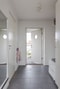 Hallen är rymlig och ljus. På golvet pryder ett grått klinkergolv och väggarna är i vitt. Här finns plats för hatthylla, skoställ och har en garderob. Det finns även mer plats för förvaring.