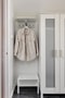 Hall : Välkomnande hall med mörkt golv. Väggarna i hallen är målade i en ljus färg samt en fondvägg i en sober ton. Längs ena väggen finns garderober och plats för avhängning av ytterkläder och skor.