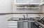 Kök : Effektivt arbetskök med mörkt golv, ljusa väggar och takfönster. Inredningen har en snygg kontrast av köksluckor i vitt och rostfritt utförande. Och över arbetsytan finns ett ljust kakel. Köket är utrustat med spis, köksfläkt och kombinerad kyl och frys.