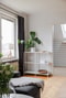 Vardagsrummet är generöst till storlek och erbjuder goda sociala ytor och plats för soffmöbelamang. Stort fönsterparti ger rummet en ljus och trivsam känsla. På golvet vilar tidstypisk parkett och väggarna är vitmålade.