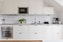 Trivsamt kök med ljus köksinredning som matchas med vitt kakel och mörkare bänkskiva. Köket erbjuder bekväma arbetsytor och goda förvaringsmöjligheter i över- och underskåp. Den maskinella köksutrustningen består av ugn med spishäll, spisfläkt, mikrovågsugn, diskmaskin samt kombinerad kyl och frys. Kökets erbjuder plats för ett matbord om cirka fyra personer. Fint ljusinsläpp från det stora fönsterpartiet och på golvet är det parkett och väggarna är vitmålade.
