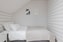 Mysigt sovrum som rymmer en säng och ytterligare förvaringsmöbel. Takfönster ger dagsljus.
