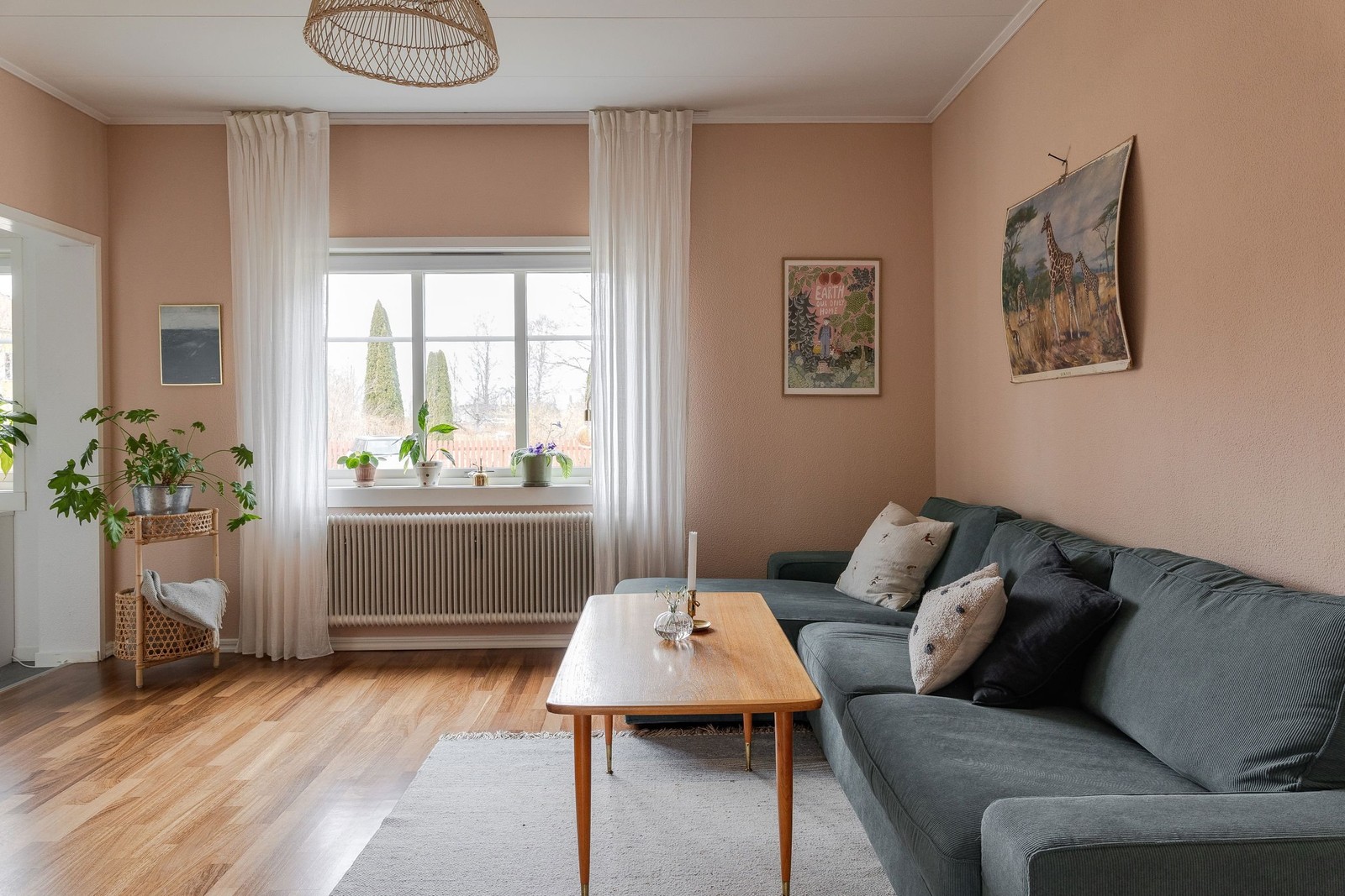 Rakt fram från hallen når ni vardagsrummet som ligger i en öppen och lättmöblerad lösning. Vardagsrummet rymmer både en generös soffgrupp, TV-bänk och ytterligare möblemang. Den vackra och fungerande kakelugnen skapar värme och karaktär till rummet. Parkett på golv och väggar i en behaglig kulör.