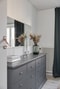 Badrummet har ljusa väggar och en grå plastmatta på golvet. Ni når badrummet från hallen och rummet är utrustat med tvättställ med kommod, spegelskåp med förvaring, WC samt en duschhörna. Tvättmöjligheter finner ni i föreningens gemensamma tvättstuga som är belägen i källaren.