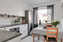 Vardagsrummet är luftigt och med sin enhetliga färgskala skapas här ett harmoniskt intryck. Det stora fönsterpartiet släpper in rikligt med naturligt ljus. Här kan ni på ett enkelt sätt skapa en social yta för både avkoppling och umgänge då rummet rymmer både soffa och matbord.