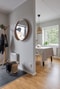 Hallen har en behaglig färgsättning på väggarna och på golvet vilar ett slitstarkt klinkergolv. Vidare in i bostaden återfinns ett genomgående parkettgolv. Redan från hallen har ni vyer in mot bostadens sällskapsdel vilket ger ett luftigt intryck. I passagen in mot bostaden finns flera garderober samt ett städskåp att tillgå. Bostaden nås via en loftgång vilket också ger möjlighet för att möblera upp med en mindre sittplats.