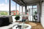Vardagsrummet har en fin rymd och här ryms en större soffgrupp. Soffan får sin naturliga plats framför fönsterpartiet. Färgsättningen i rummet harmoniserar med den moderna och varma känslan som bostaden erbjuder. Härifrån nås bostadens balkong som blir en härlig och naturlig förläning av vardagsrummet. Inglasningen ger en skyddad atmosfär vilket gör att balkongen kan nyttjas under större delar av året.