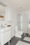 Rymligt och helkaklat badrum med mörkt klinkergolv och vitt kakel på väggarna. Här finns även en praktisk tvättdel med tvättbänk, tvättho, tvättmaskin och torktumlare. Badrummet är utrustat med toalett, dusch, kommod samt väggskåp som erbjuder bra förvaringsmöjligheter.