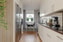 Stilrent kök i öppen planlösning mot vardagsrummet, vilket skapar en social och luftig känsla. Här finns gott om plats för en rymlig matplats med trevlig utsikt mot framsidan. Köket har vit skåpsinredning, vitt kakel samt en svart mosaikfond som ger en fin kontrast. Generösa bänkytor underlättar matlagningen och under väggskåpen sitter infälld belysning. Den maskinella utrustningen är i rostfritt utförande och består av häll, inbyggd ugn och mikro, diskmaskin samt fristående kyl och frys i fullhöjd. På golvet ligger parkett och väggarna är målade i vitt.
