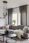 Tilltaget vardagsrum som ger goda möbleringsalternativ. Rummet genomsyras av fint ljusinsläpp och i kombination med rummets färgval skapas en trivsam miljö.