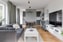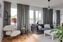 Vardagsrummet är ljust och luftigt med vita väggar och parkettgolv samt en grågrön fondvägg vid matplatsen som fångar upp kökets grågröna färgton. De stora fönsterpartierna släpper in rikligt med dagsljus och skapar en inbjudande atmosfär i hela rummet. De öppna ytorna ger plats för både soffgrupp och matplats, vilket gör rummet perfekt för både avkoppling och socialt umgänge. Vardagsrummet har ett naturligt flöde in mot köket som förstärker den sociala karaktären.