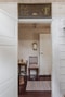 Hall som leder in till vardagsrummet samt till trappan till övre plan. Här finns plats för en förvaringsmöbel.