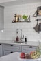 Köket har en exklusiv känsla med gråa köksfronter i ren design. Bänkskivan erbjuder gott om arbetsyta och köksön ger extra förvaring. Köket är utrustat med spishäll, spisfläkt, inbyggd ugn och mikrovågsugn samt en diskmaskin och en kombinerad kyl och frys. Den trivsamma matplatsen får härligt ljus från det stora fönsterpartiet och ligger i anslutning till köket. Härifrån nås även bostadens balkong med utsikt över föreningens poolområde och Toftasjön.