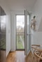 Välkomnande hall med avhängningsmöjligheter direkt till höger. På golvet ligger det ett snyggt ekgolv som följer med genom hela lägenheten och skapar ett enhetligt intryck. Väggarna är vitmålade och det finns tre garderober och ingång till badrummet. Entrén är skyddad av en överbyggd loftgång där yta ges för att kunna möblera upp med ett utemöblemang. Härifrån blickar man ut över den vackra innergården.