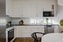 Modernt och välutrustat kök med vita köksluckor. Köket är utrustat med spishäll, spisfläkt, inbyggd mikrovågsugn, ugn och kombinerad kyl och frys. Mörk bänkskiva med vitt kakel satt som stänkpanel.