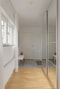 Hall: Hallen har goda ytor för både avhängning och ger plats åt en förvaringsmöbel. Vid entrédörren ligger ett mörkt klinkergolv och i taket sitter spotlights för en behaglig ljussättning. I anslutning till hallen finns även en större klädkammare.
