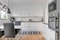Kök med modern och funktionell inredning som erbjuder både generösa arbetsytor och bra förvaringsmöjligheter. Köksinredningen går i ljusa toner medans mycket av den maskinella utrustningen är i rostfritt stål vilket ger ett stilrent intryck. Den maskinella utrustningen består av en diskmaskin, inbyggd ugn och mikrovågsugn, spishäll, spisfläkt samt en kombinerad kyl och frys.