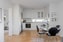 Bostaden har ett modernt kök som är välutrustat. Den maskinella utrustningen i rostfritt utförande bryter av snyggt mot det resterande vita köket. Köket har både bekväma arbetsytor och bra skåpsförvaring i över- och underskåp. Som stänkskydd sitter ett vitt kakel och den mörka arbetsbänken belysas av spotlights. Ovan arbetsbänken sitter även två fönsterpartier som skänker ett fint ljusinsläpp. Den maskinella köksutrustningen består av kombinerad kyl och frys, diskmaskin, spishäll, spisfläkt, ugn samt inbyggd mikrovågsugn. I anslutning till köket finns även plats för en trivsam matplats.