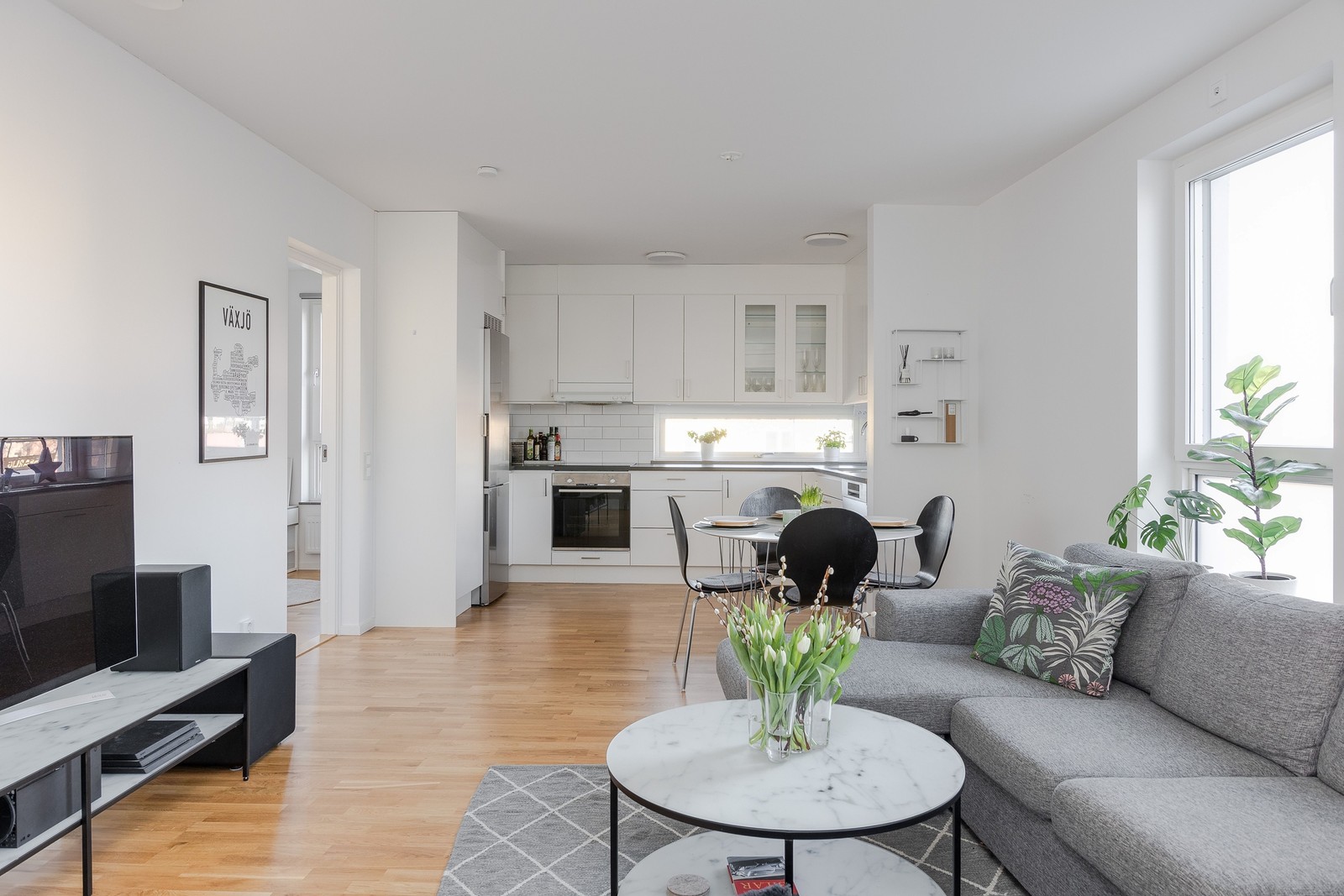 Härligt vardagsrum med öppen känsla mot köket. Här finns plats för soffgrupp och matsalsbord. Samma golv som löper från hallen fortsätter in i rummet och väggarna är ljust målade. Flera fönster skänker härligt ljusinsläpp och här kommer ni ut till den generösa balkongen. Glaspartierna ger en skyddande miljö men kan även öppnas upp under årets varmare månader. Balkongen ger plats för en avslappnande loungegrupp och vackra växter.