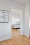 Ljus och välkomnande hall med parkettgolv och ljust målade väggar. Ytterdörren med överljus samt ett mindre fönster ger hela hallen ett fint ljusinsläpp. Det finns två garderober för förvaring och en fast hallmöbel för praktisk avhängning för ytterkläder. Till entrén till lägenheten tar ni er via en loftgång och här har ni en härlig vy över den rogivande innergården.