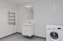 Badrum med vet kaklade väggar och våtrumsmatta i grå nyans . Här har man en duschhörna, tvättställ, handdukstork, kombinerad tvätt och torkmaskin, WC och spegelskåp med förvaring.