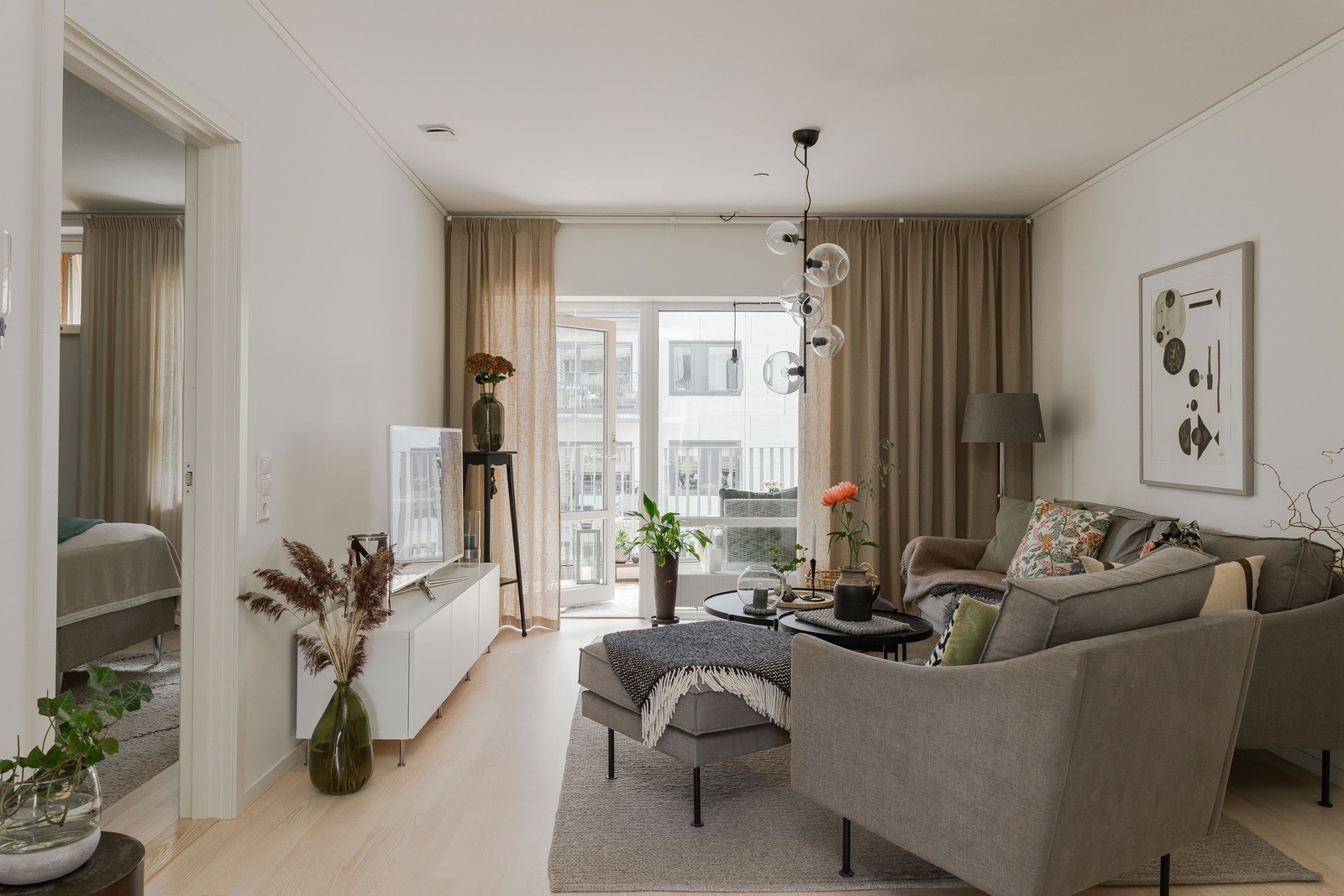 Bostadens interiör präglas av ljusa, enhetliga materialval och ett genomgående parkettgolv som bidrar till ett stilrent och behagligt intryck. Det välutrustade köket bjuder in till matlagning och umgänge, komplett med all nödvändig maskinell utrustning och plats för en matgrupp. En fransk balkong ger köket extra ljusinsläpp och karaktär. Vardagsrummet erbjuder generösa ytor och flexibla möbleringsmöjligheter – perfekt för både vardagsliv och sociala stunder. Härifrån nås även den inglasade balkongen, en härlig förlängning av bostaden som kan nyttjas stora delar av året. De stora fönsterpartierna bidrar till ett vackert ljusflöde och skapar en inbjudande atmosfär. Lägenheten rymmer två bra sovrum med plats för säng och förvaring. Det helkaklade badrummet är rymligt och modernt, utrustat med dusch och en praktisk tvättdel som underlättar vardagen. Här får ni ett hem att trivas i – med både stil och funktion, i ett område som erbjuder det bästa av två världar: naturens lugn och stadens puls inom räckhåll.