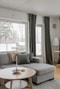 Bostadens kök och vardagsrum har en fin övergång där möbleringsmöjligheterna är flexibla. Stora fönsterpartier ger en ljus känsla åt hela rummet. Rummet ger gott om plats för en trivsam soffgrupp. Från vardagsrummet nås balkongen som ger en förlängning av bostadens samvaroyta från tidig vår till sen höst.