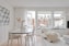 Stilrent, ljust och lättmöblerat vardagsrum med stora fönster mot uteplatsen. Vita väggar och ljust ek-golv. Plisségardiner i varje fönster.