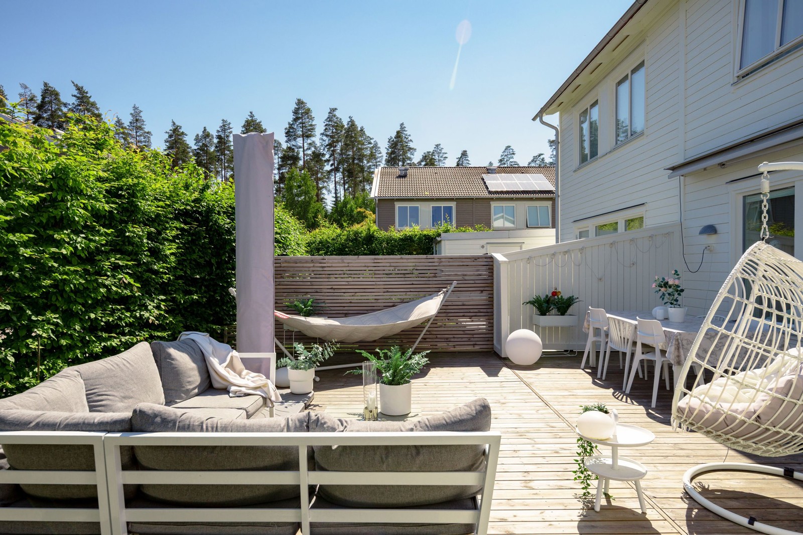 På baksidan finns ett stort, insynsskyddat tralldäck med plats för matbord, loungemöbler, grill, pizzaugn och mer.