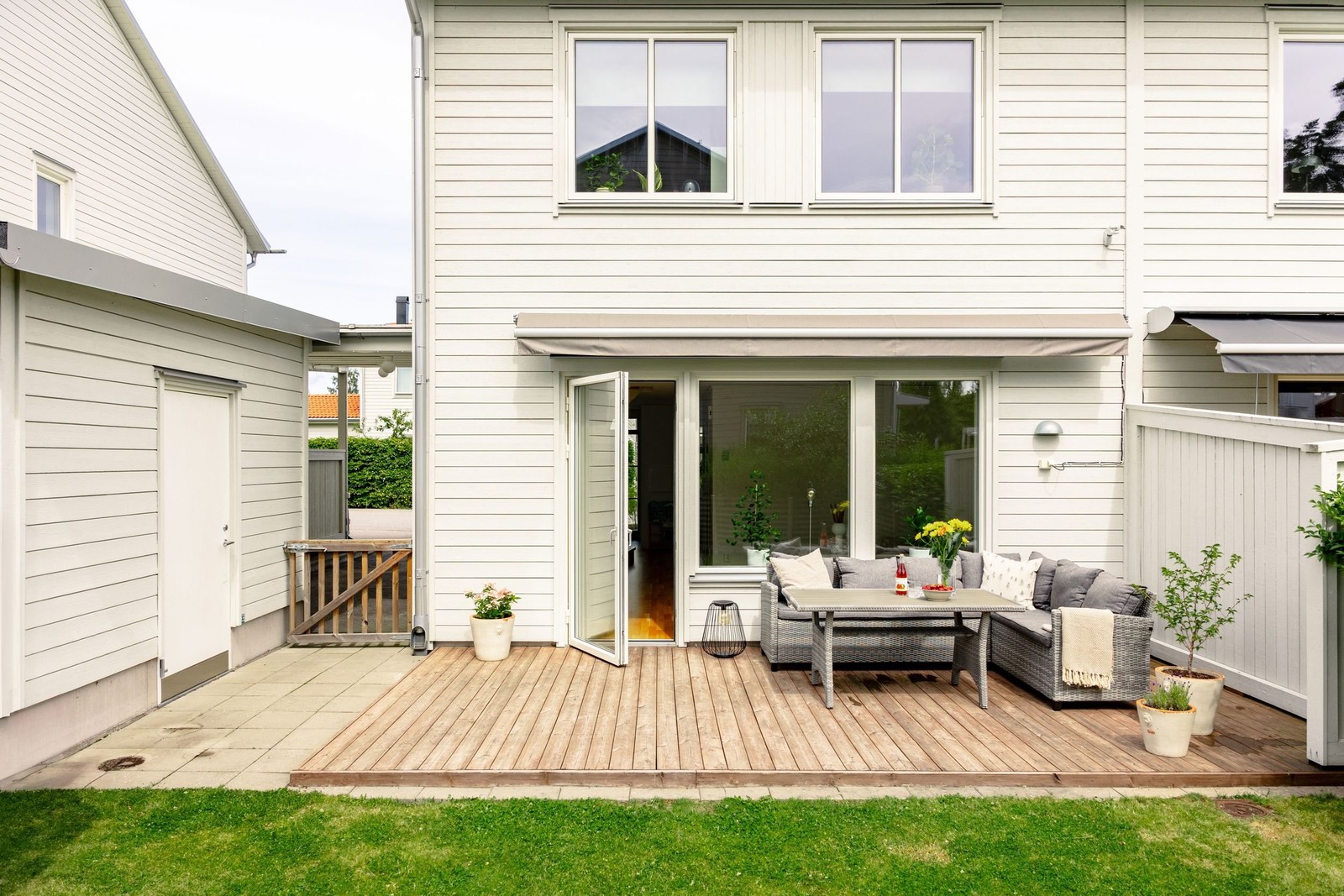 Vardagsrummet erbjuder ett härligt ljusinsläpp från de generösa fönsterpartierna. Golvet är även här i ekparkett och väggarna är i ljus kulör. Här erbjuds utrymme för en stor soffgrupp, soffbord samt tv möbel. Från vardagsrummet når man baksidans uteplats i form av ett stort trädäck. Här finns plats för utemöbler. Det erbjuds även en markis och bra med gräsytor.