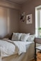 Bostadens första sovrum nås direkt från hallen. Till vänster finns en inbyggd skjutdörrsgarderob med inredning från Elfa, vilket skapar mängder av förvaringsmöjligheter. Rummet har en rofylld färgsättning med mjuka toner. Den möblerbara ytan ger god plats för en enkelsäng och skrivbord. Ett fönsterparti mot framsidan släpper in ett behagligt ljus.