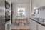 Modernt och ljust kök som har god plats för ett matbord. De härliga mindre fönsterpartierna vid arbetsbänk och matsal släpper in ett naturligt vacker ljus. Den maskinella utrustningen består av inbyggd ugn och mikrovågsugn, diskmaskin, spishäll, spisfläkt samt kyl och frys i fullhöjd från Bosch.