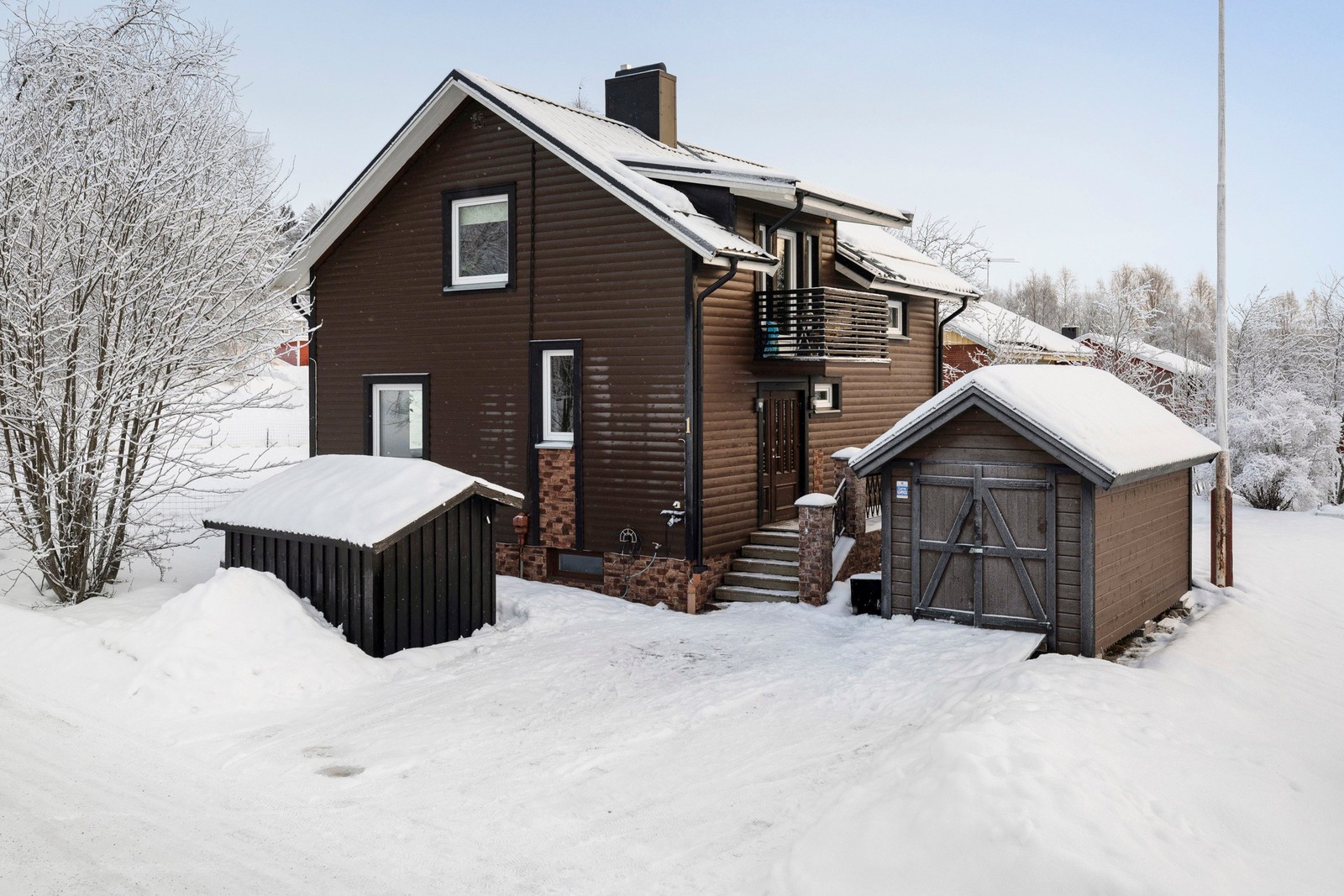 Pampig ny ytterdörr med sidoljus leder in till den öppna entréhallen. Det fina köket har vita släta luckor och snygg bänkskiva med ingjuten ho. Köket erbjuder väldigt gott om förvaring och arbetsyta samt full maskinell utrustning. Härifrån har du öppen planlösning mot vardagsrummet som har utgång till den stora altanen. I entréplan finns också ett äldre badrum och ett av husets tre stora sovrum. På övre plan finns ett stort kallförråd samt två rymliga sovrum varav det ena har tillgång till det fina badrummet med kakel och klinker och det andra inrymmer en stor klädkammare. På övervåningen finns också en balkong med härlig utsikt. I källaren har du gott om förvaringsmöjligheter i form av pannrum och förråd. Källaren är oinredd och har målade väggar och golv. Villan är belägen på friköpt hörntomt med gott om plats för lek.