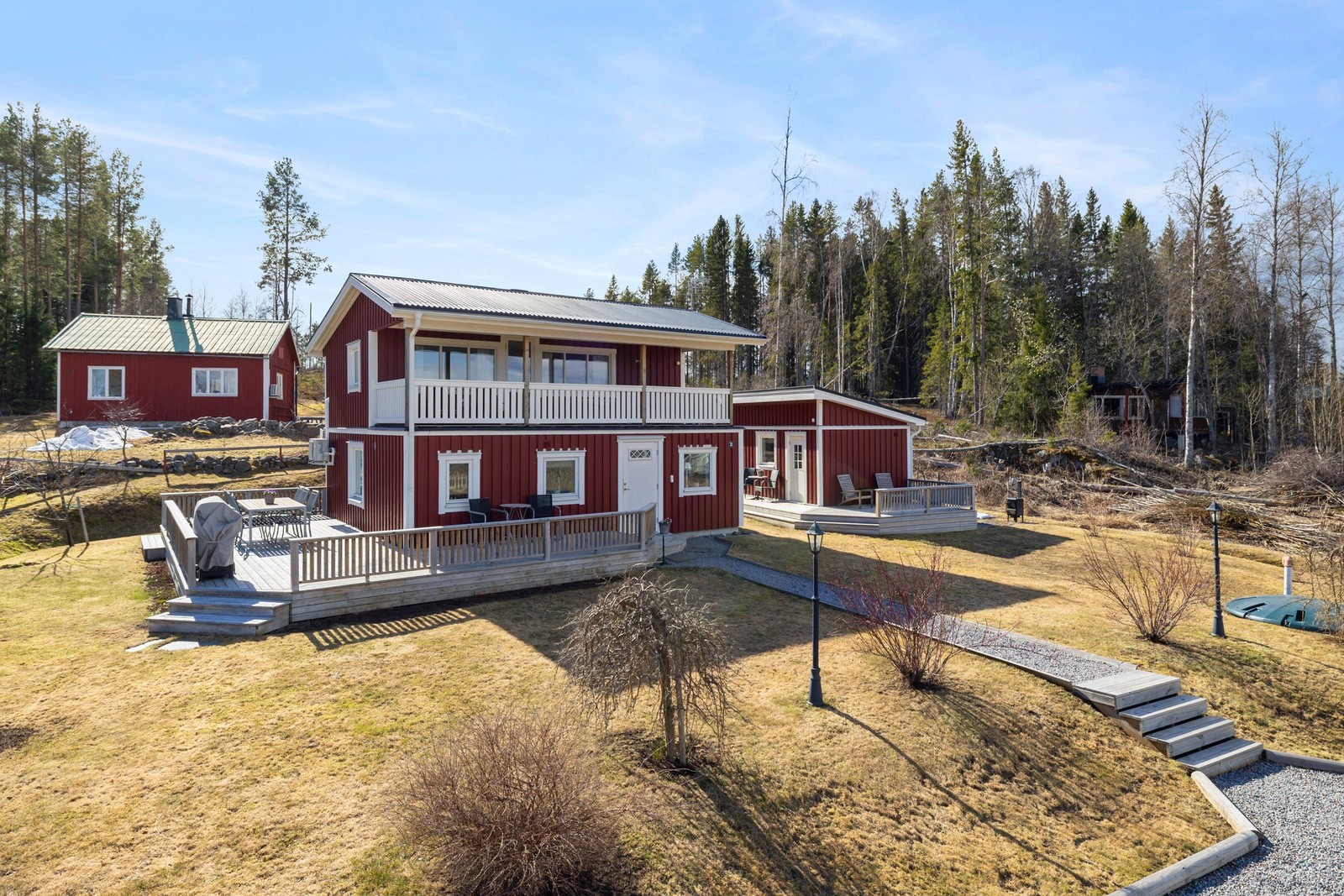 Byggnaden är i grunden en stuga från 60-talet som i början av 00-talet byggts om till nuvarande utformning. Stugan har fokus på de sociala ytorna som har en oerhört mysig utformning, magisk utsikt och mysiga eldstäder. Trivsamt kök med matplats som inrymmer matbord för 4 personer. I öppen planlösning från matplatsen finns det charmiga vardagsrummet som har en värmande öppen spis som tillför trevnad till vardagsrummet. Entréplan är försedd med el-golvvärme. Övre plan har en mysig sällskapsdel med stora fönsterpartier som ger både fin utsikt och behagligt ljusinsläpp, härifrån finns utgång till en tilltagen och överbyggd balkong som även den bjuder på utsikt mot vattensidan. Övre plan har även en större sovalkov som inrymmer dubbelsäng samt nättare förvaringsmöbel. Intill entréhallen finns ett rymligt helkaklat badrum med bastu och tvättmaskin som är kombinerad med torktumlare.