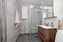 Stilrent badrum med stilren våtrumsmatta och tapet med el-golvvärme för en skön komfort. Utrustat med duschplats med glasvägg samt handfatskommod med tillhörande spegelskåp. Belysning via dimbara spotlights i taket. Förberett för tvättmaskin.