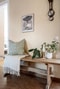 Hall med linoleummatta och gula tapeter. Hatthylla finns.