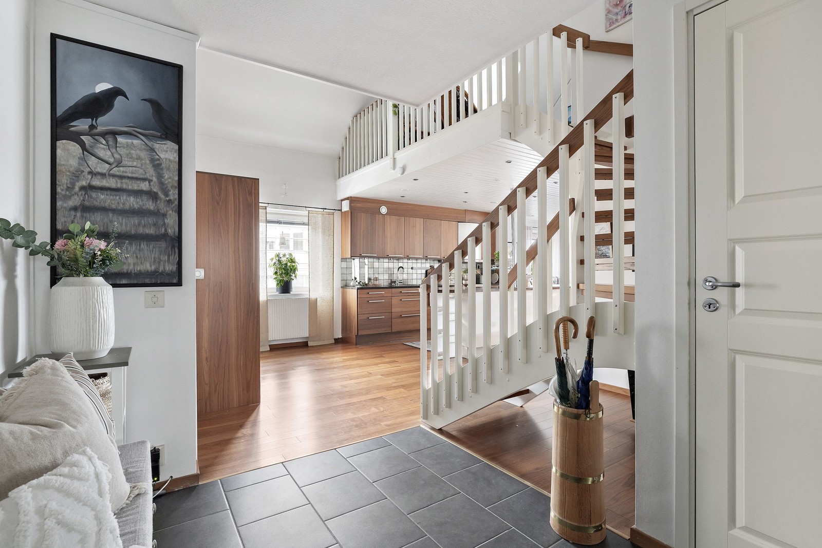 På nedre plan återfinns en praktisk hall med klinkergolv och gott om förvaring samt ett av de tre sovrummen. Här finns även ett praktiskt och arbetsvänligt kök från HTH som löper vidare i öppen planlösning mot vardagsrummet med stora ytor för både en matgrupp och soffa. Här nås även en av de två inglasade balkongerna som bostaden har. Det ena badrummet som återfinns på detta plan är praktiskt försett med tvättmaskin. Genom vacker trapp i ek når du övre plan, här finns det andra badrummet, det har stilfulla val av kakel och klinker samt en rymlig bastu i anslutning som ger vardagen en extra guldkant. Allrummet på denna våning kan nyttjas utefter behov och önskemål, kanske en extra sittgrupp eller kontorsyta. De två sovrummen är i bra storlek, varav det ena har utgång till balkong, och det andra får en unik känsla tack vare utformningen av tak och fönster.